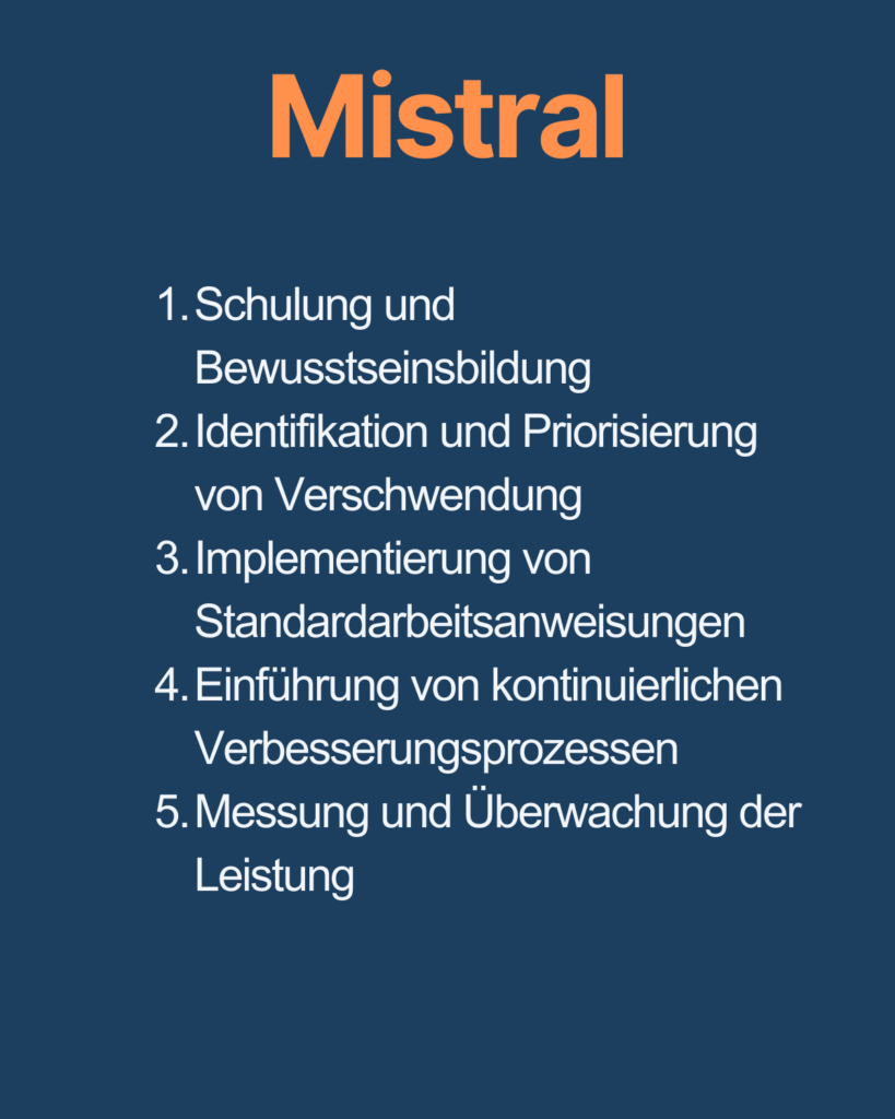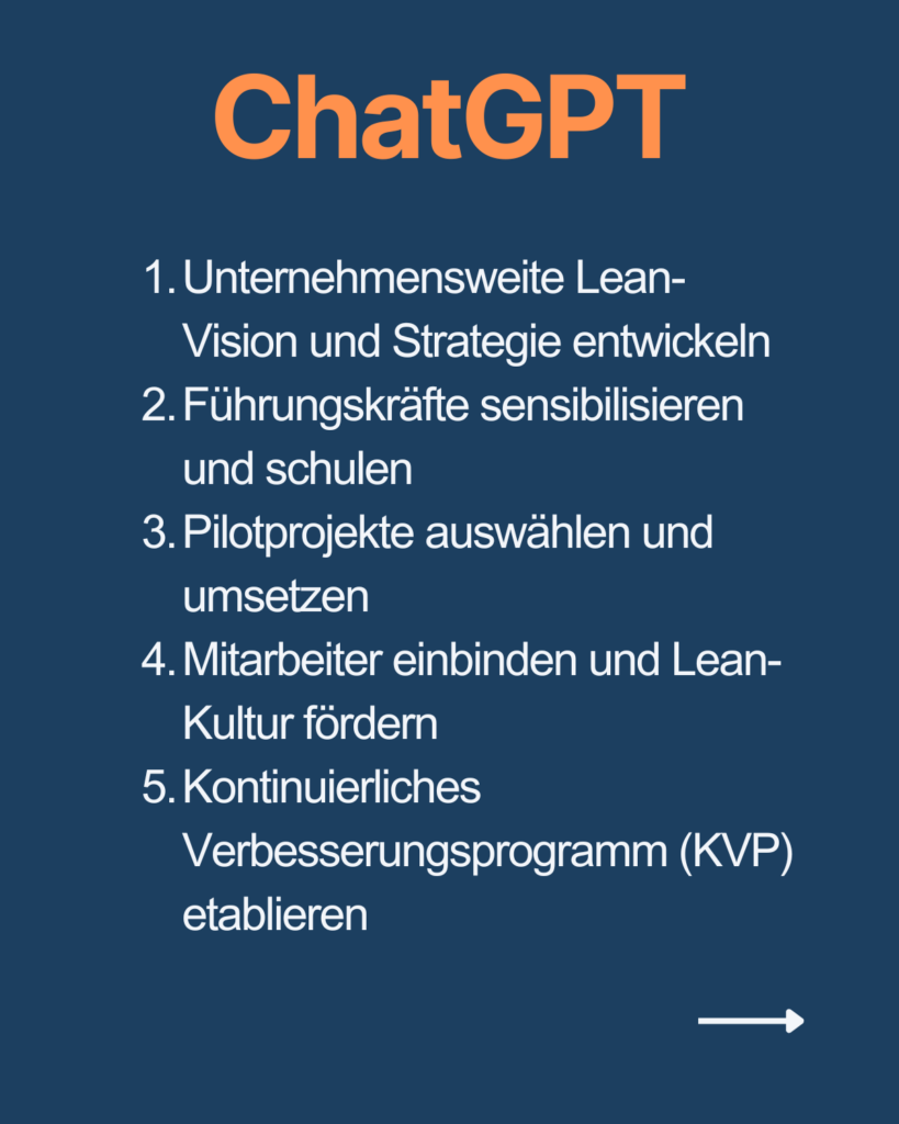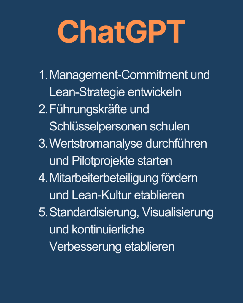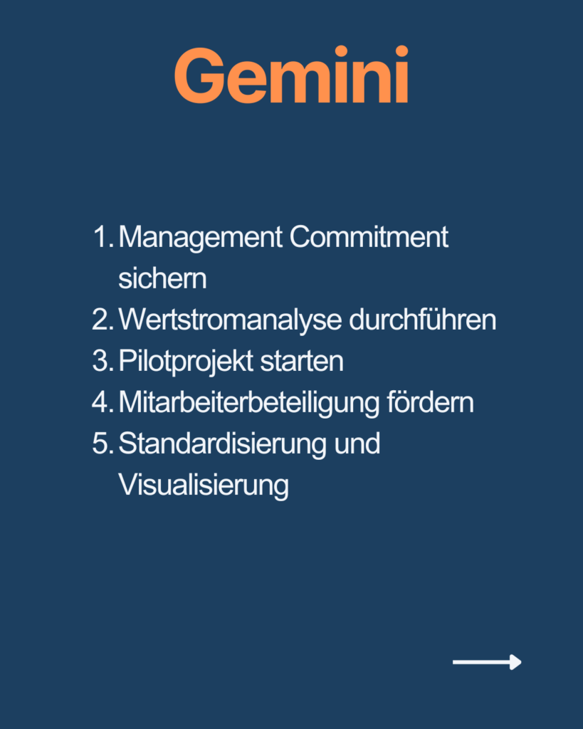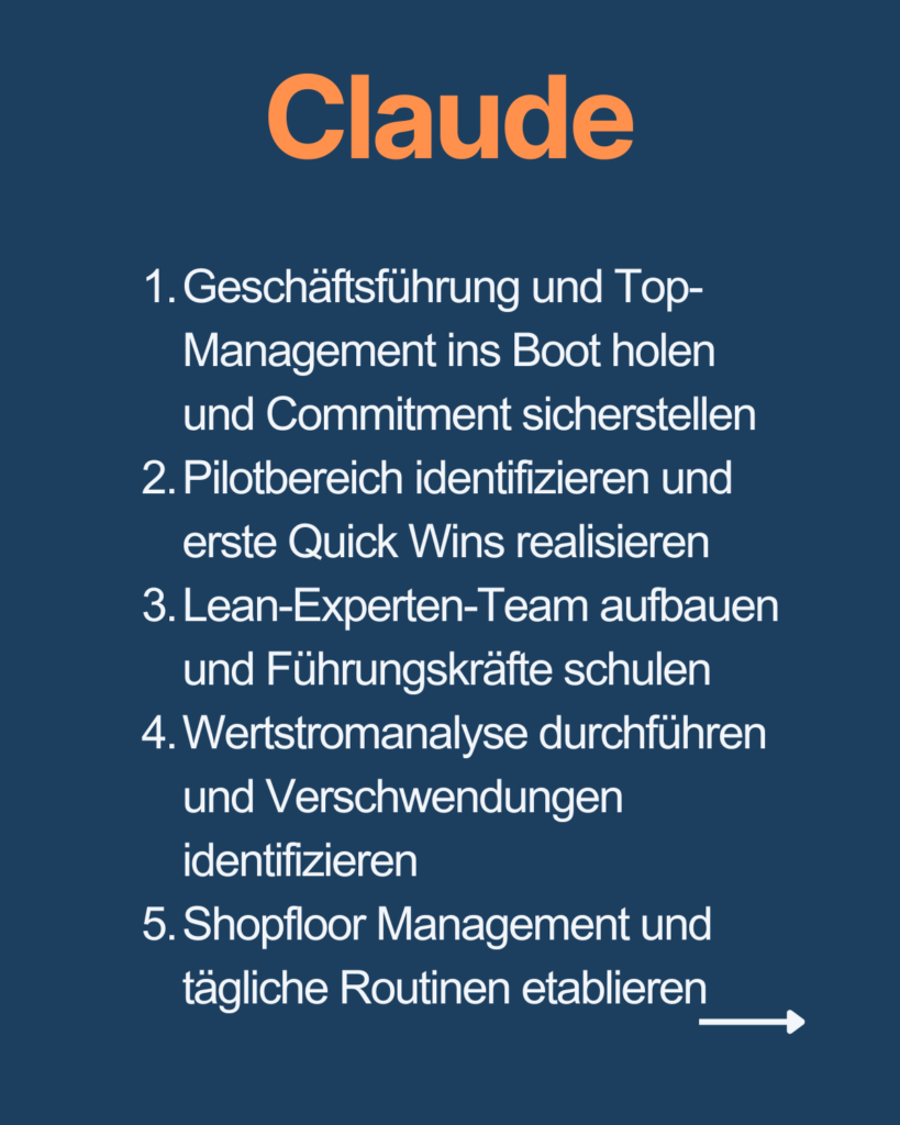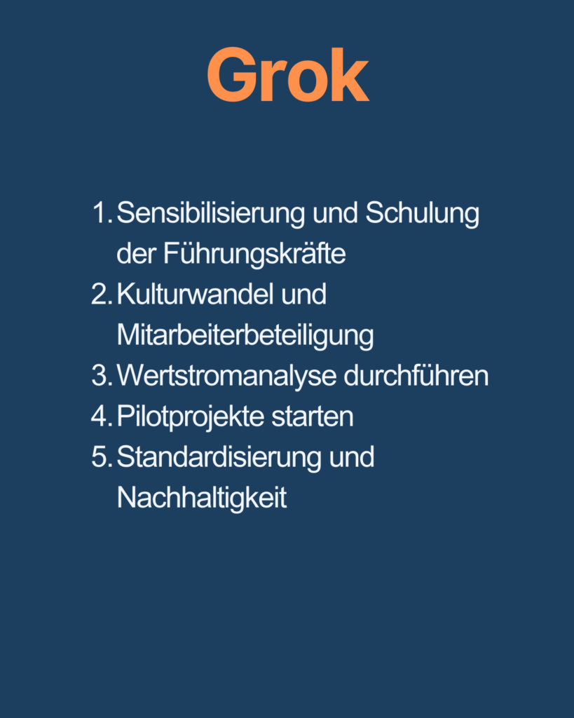 Ich habe die KI-Leanberater ChatGPT, Copilot, Gemini, Claude, Perplexity, Mistral und Grok befragt, welche Top 5 Aktionen sie unternehmen würden, um in einem Wirtschaftsunternehmen Lean einzuführen.