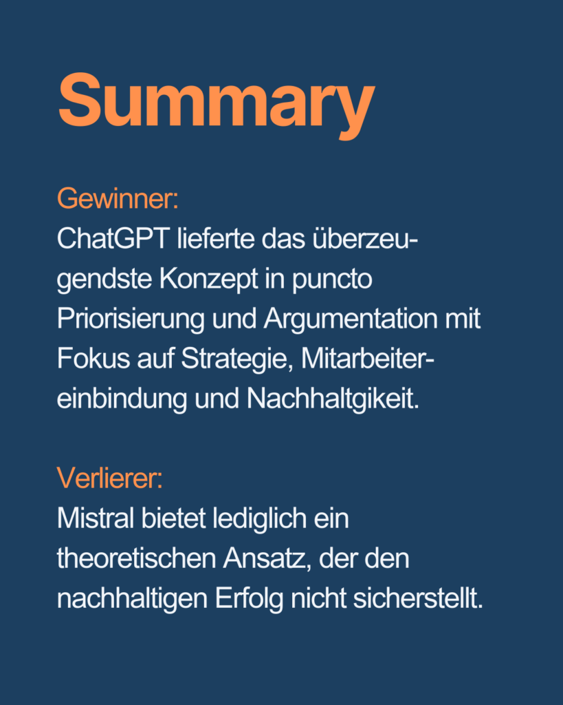 💡 ChatGPT lieferte aus meiner Sicht die überzeugendsten Aktionen und Priorisierungen mit Fokus auf Strategie, Mitarbeitereinbindung und Nachhaltigkeit.